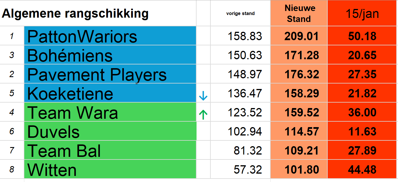 Intussen werden al 5 van de 10 avonden van deze Pattoncompetitie gespeeld en dat veranderde heel wat in de rangschikking.